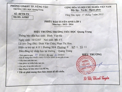 Thực tế, qua tìm hiểu của phóng viên TTXVN, trong phiếu báo tuyển sinh lớp 1 của các trường trên địa bàn TP. Vũng Tàu có sự khác nhau. Cụ thể, Trường Tiểu học Quang Trung có ghi giấy má cần mang theo để đăng ký nhập học là “bản phô tô sở hữu nhà ở của bố mẹ”, còn Trường Tiểu học Lê Lợi thì ghi “bản phô tô hộ khẩu hoặc tạm cư”. Thầy Lương giảng giải: Quan điểm của Phòng Giáo dục là tuyển sinh theo địa bàn ngụ, để học trò được học gần nhà và việc cân đối, xếp đặt, phân tuyến cho học sinh của Phòng Giáo dục được hợp, chủ động, tránh tình trạng trường thừa, trường thiếu học trò.